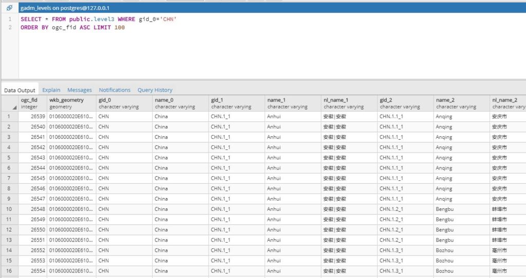 执行查询语句,目的是查询广州的市一级的区域边界数据,ST_AsGeojson是为了查询GeoJson数据用于显示。